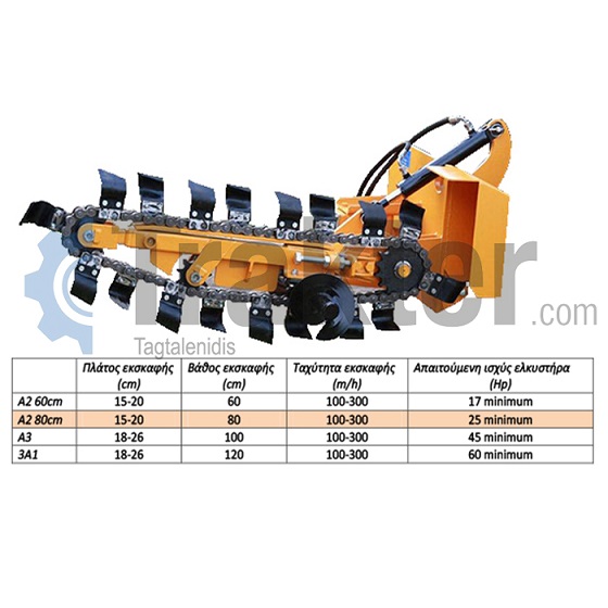 Excavation width 18-16cm Depth of excavation 80cm Excavation speed 100-300m/h Required engine power from 25hp